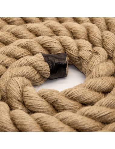 Corda di iuta a triplo ritorto realizzata con filato di iuta naturale con aggiunta di olio, che facilita la lavorazione e migliora le proprietà della corda